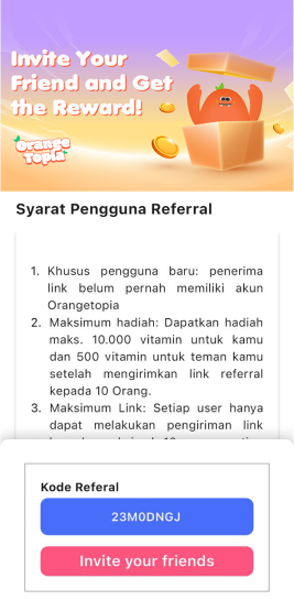 Dapatkan lebih banyak coins dengan mengundang teman menjadi user Orangetopia. Pastikan kode referral yang dimasukan sesuai, user baru hanya dapat menggunakan satu kode referral.